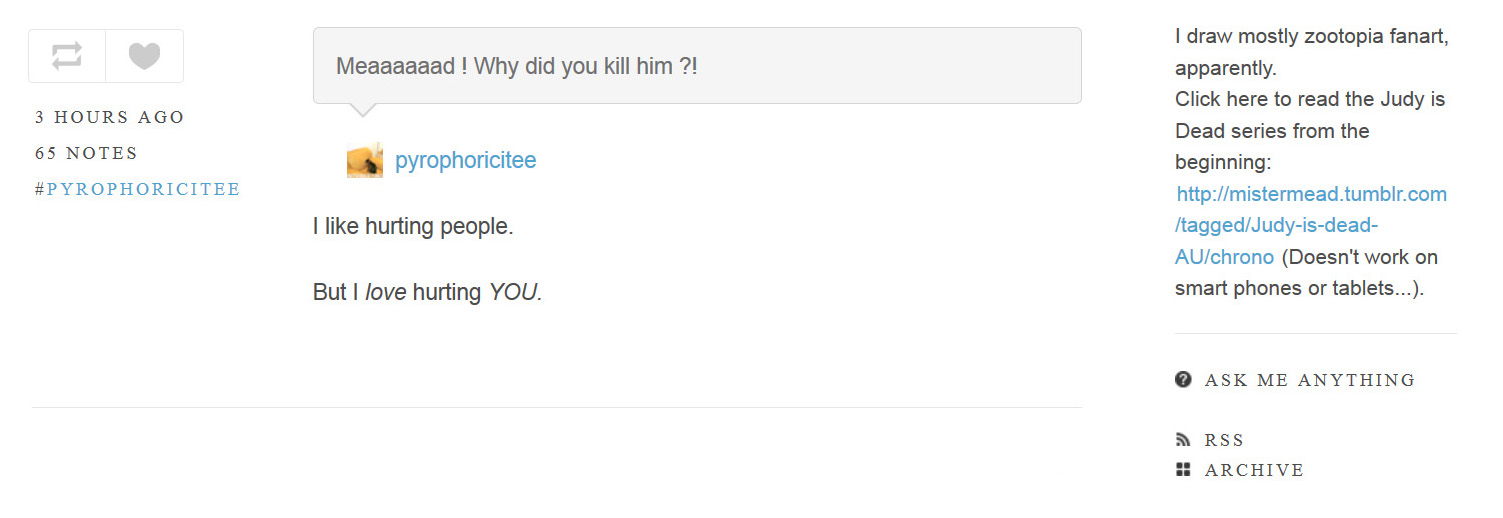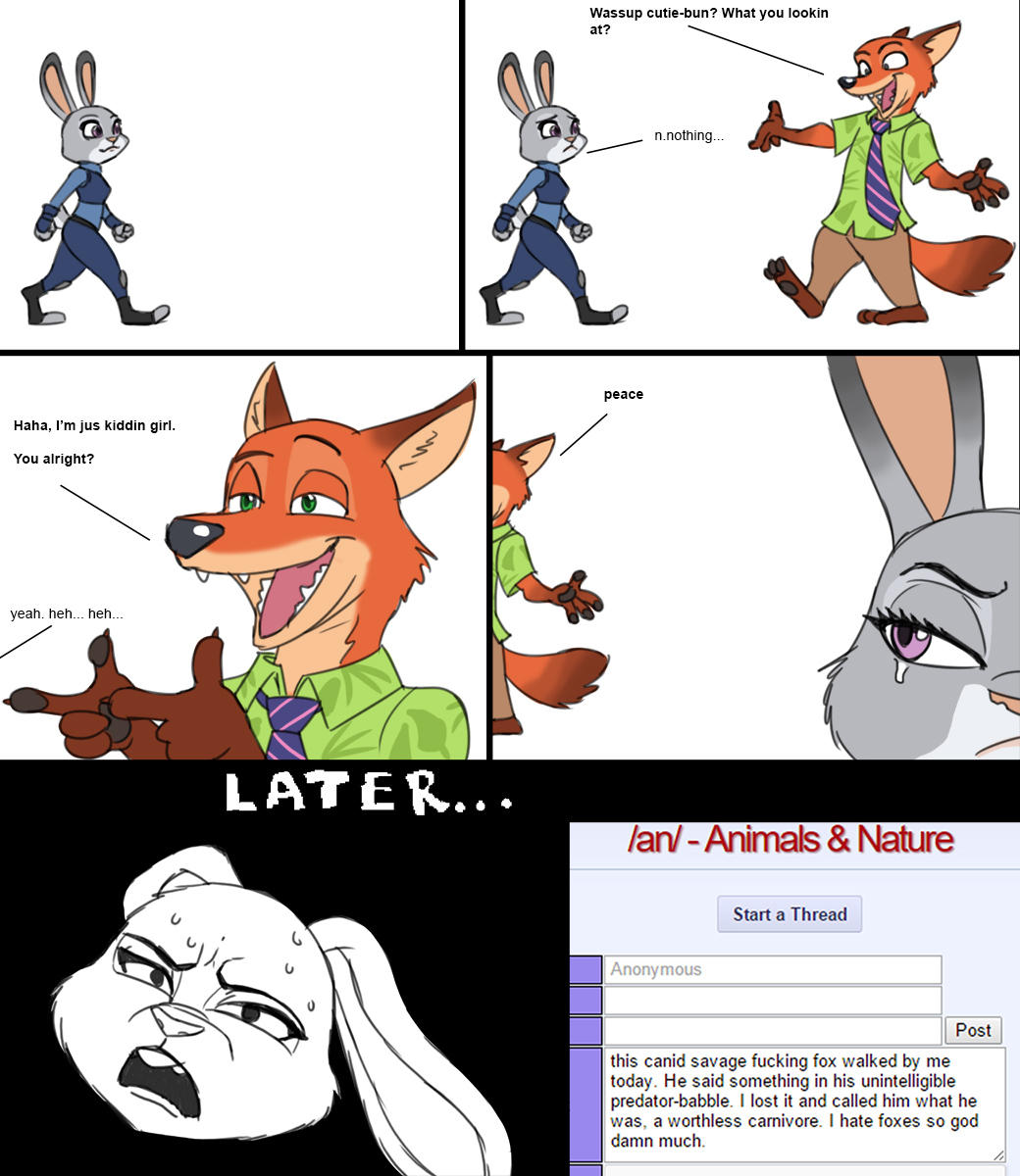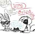 >what kind of dates would Nick and Judy have?Nick would show her the sites of Zootopia that he knows, and Judy would drag Nick to see the site of Zootopia he never wants to know. Nick is functional, and he likes what he knows, and he has pride about knowing the best-kept-secrets of Zootopia. In his mind, Judy wants to see the touristy stuff. LA metaphor: Nick wants to take Judy to Wurstkuche, but Judy wants to get Pinks. However, Nick'll warm up to the enthusiasm Judy has for where she goes, and might be coaxed so see things her way.